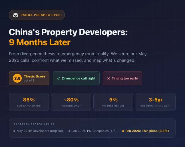 This piece is a companion to our January piece on property management companies, where we scored our original PM thesis 4 out of 5 and explored how the downstream effects of the developer crisis were reshaping the PM sector. Today we go upstream, back to the developers themselves, to assess what we got right, what we got wrong, what has changed, and what the latest sell-side research tells us about the road ahead. For the background on the Three Red Lines, the history of the crisis, and the broader macro context, we’d point readers to the original May 2025 piece. We won’t rehash all of that here. Instead, we’ll focus on what’s different.