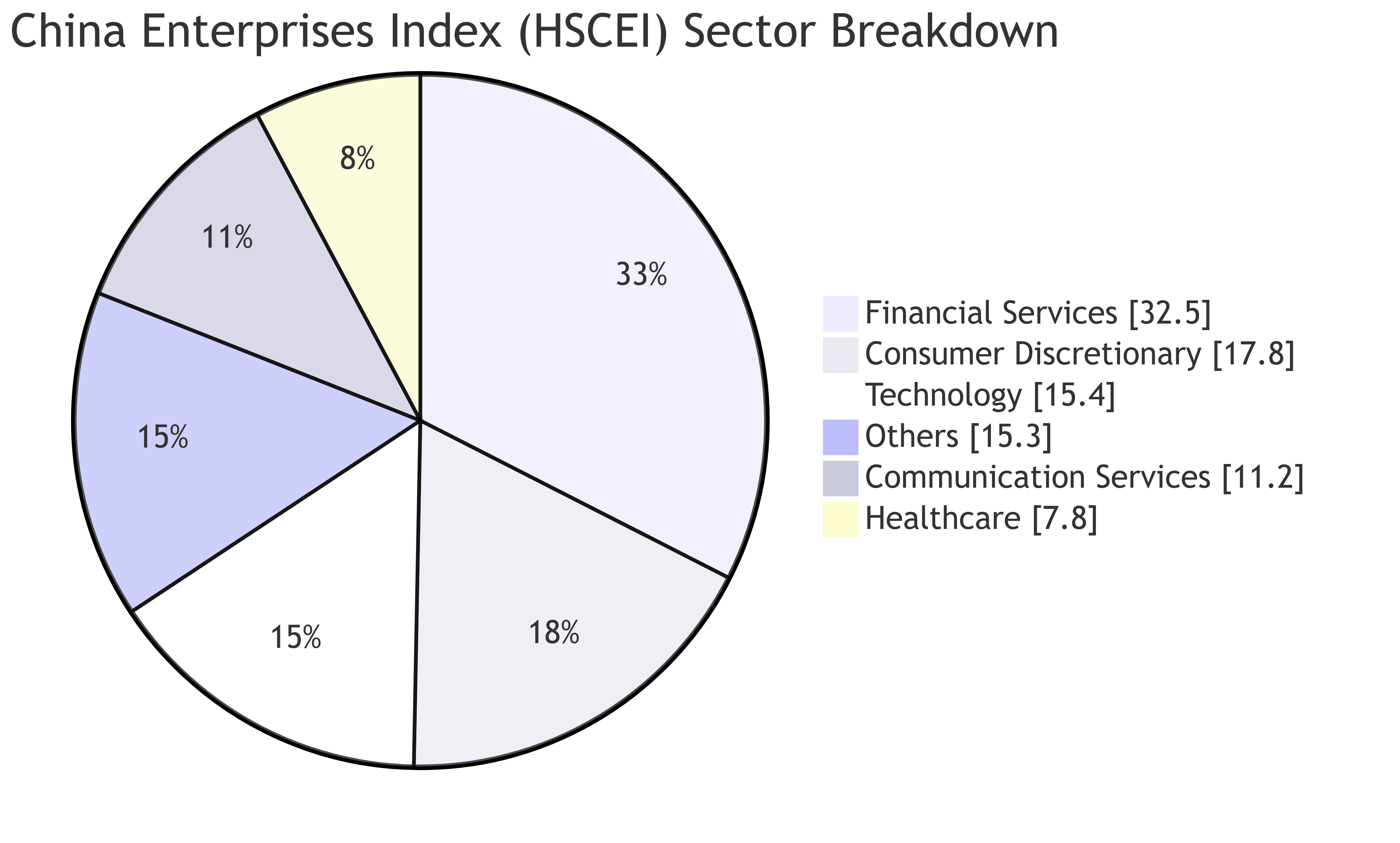 What if you dont want the HK financial sector to dominate you china holdings, but still like the HK valuations? This is where HSCEI comes in. It is the Hang Seng China Enterprises Index (HSCEI) and it represents the 50 largest H-share companies from mainland China listed on the Hong Kong Stock Exchange. Its sector composition shows a notable concentration in Financial Services (32.5%), Consumer Discretionary (17.8%), and Technology (15.4%), reflecting the growth sectors within the Chinese economy. Notably, Tencent Holdings (8.2%) and Meituan (7.4%) hold the top spots, with a mix of financial institutions like China Construction Bank and Industrial & Commercial Bank of China also represented. This index provides a robust snapshot of the Chinese corporate presence in Hong Kong, appealing to investors who seek exposure to key economic players within mainland China.