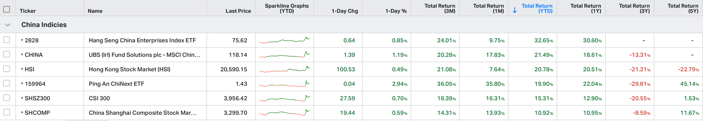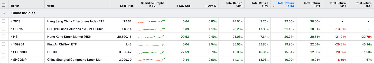 The KraneShares CSI China Internet ETF (KWEB) is a U.S.-listed ETF designed to track leading Chinese internet companies. Its sector composition is dominated by Consumer Discretionary (45.2%) and Communication Services (32.6%), a breakdown that underscores the ETF’s focus on the Chinese internet and e-commerce sector. The top holdings—PDD Holdings (12.4%), Tencent Holdings (11.2%), and Alibaba Group (9.8%)—illustrate KWEB’s high concentration in digital giants that are central to China’s tech-driven consumer economy. This is obviously an ETF ragtag than an index, but it is a popular choice for those wanting exposure to the Chinese digital landscape without navigating mainland or Hong Kong markets directly, so I feel compelled to include it.