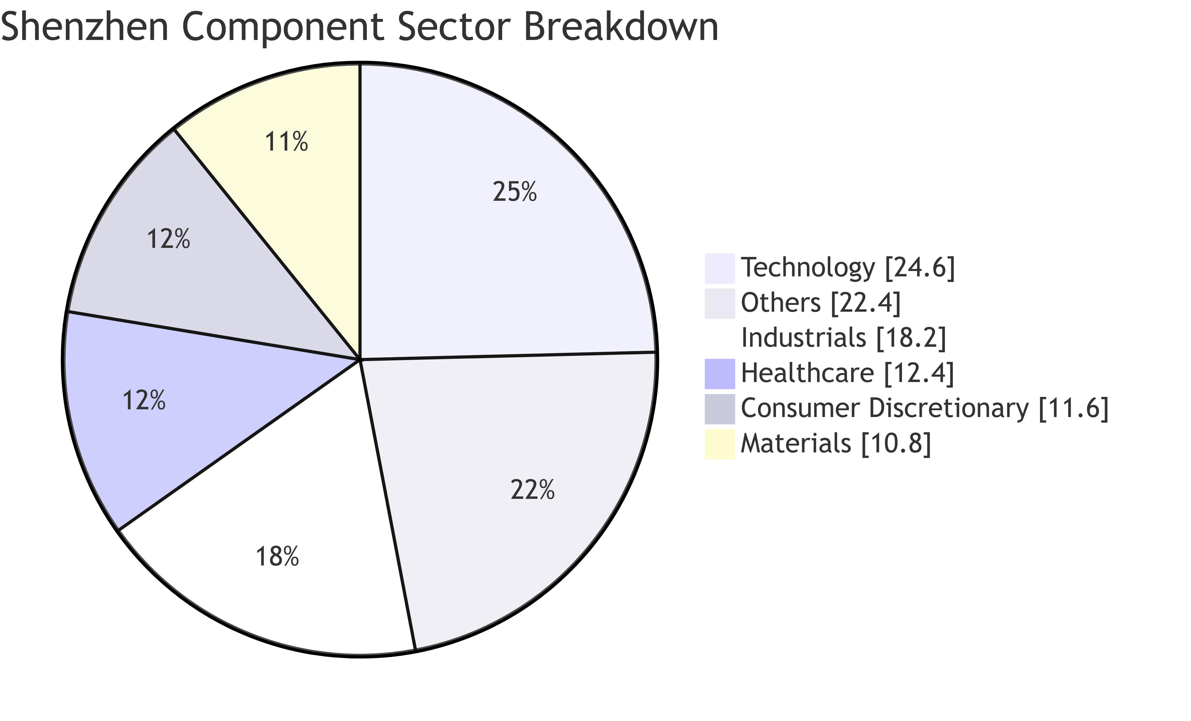 Known for its growth-oriented composition, the Shenzhen Component Index focuses on technology-driven and innovative companies. The index’s heaviest sector is Technology (24.6%), followed by Industrials (18.2%) and Healthcare (12.4%). Leading companies include Contemporary Amperex Technology (CATL) (5.6%) and Ping An Bank (3.2%), reflecting Shenzhen’s role as China’s innovation and tech hub. The Shenzhen Component Index offers an ideal lens into the rapidly evolving and growth-oriented sectors of China’s economy, catering to investors with an interest in China’s technology and industrial advancements.