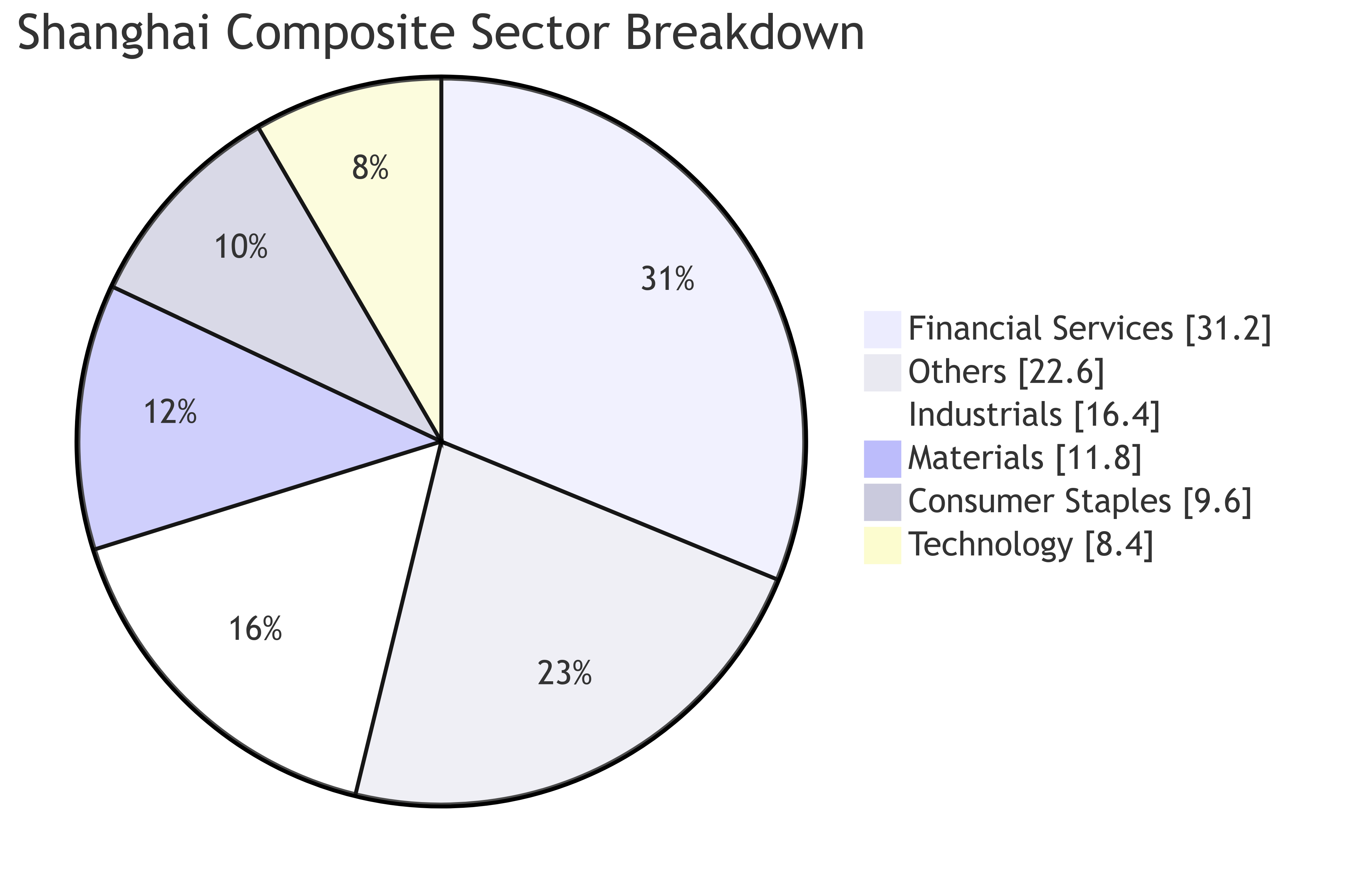 The Shanghai Composite Index (SHCOMP) captures the entirety of the Shanghai Stock Exchange, including over 2,000 companies. Financial Services constitute the largest sector (31.2%), with Industrials (16.4%) and Materials (11.8%) also making up substantial portions. Kweichow Moutai (4.2%) is a key holding, and major financial institutions like Industrial & Commercial Bank of China and China Merchants Bank are also prominent. The SHCOMP reflects the traditional economic foundation of China, with financial and industrial sectors forming its core, giving it an appeal for those interested in the broader Chinese economy.